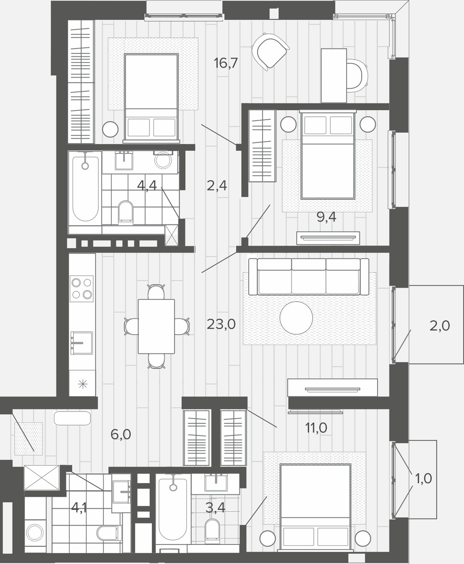 Просторная квартира с постирочной, тремя спальнями и большой гостиной. У детей достаточно места, чтобы искать здесь свои маленькие приключения. В то время как взрослые делятся историями за бокалом вина на правильно организованной кухне с большим количеством места.